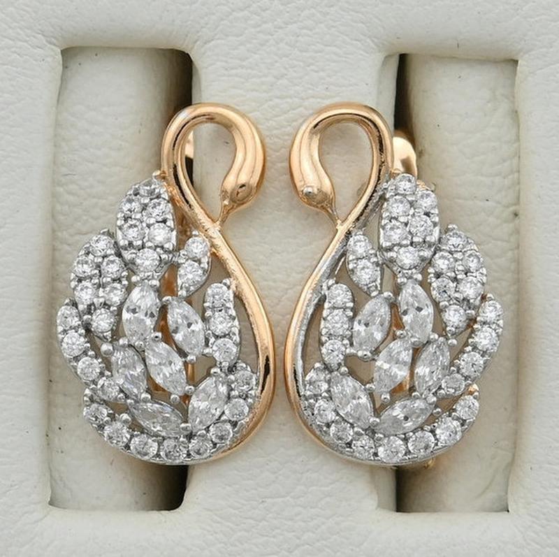 Сережки Xuping розмір 17х10 мм білі фіаніти вага 2.7 м з родированием позолота 18К.