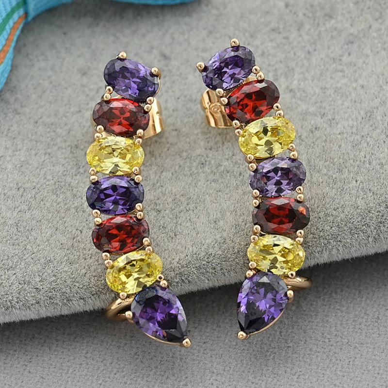 Сережки Xuping розмір 30х5 мм фіолетово червоні фіаніти вага 5.2 р позолота 18К.