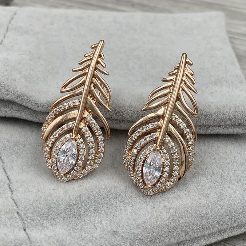Сережки Алмазні пір'ячко 24214 розмір 32х15 мм куб цирконій вага 5.4 р позолота РВ.