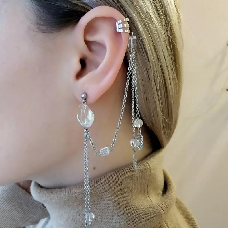 Асимметричные серьги - пусеты (гвоздики) ручной работы с натуральным горным хрусталем на фурнитуре из нержавеющей стали. Одна сережка длиной 2 см, другая с цепочками 10 см и с каффой. Горный хрусталь — минерал универсальный, он подходит всем знакам зодиака. По утверждениям магов, горный хрусталь поможет своему владельцу обрести душевную гармонию, сконцентрироваться, прояснит сознание и улучшит работу мозга. Камень научит регулировать и правильно использовать внутренние силы и убережет от негативного воздействия извне