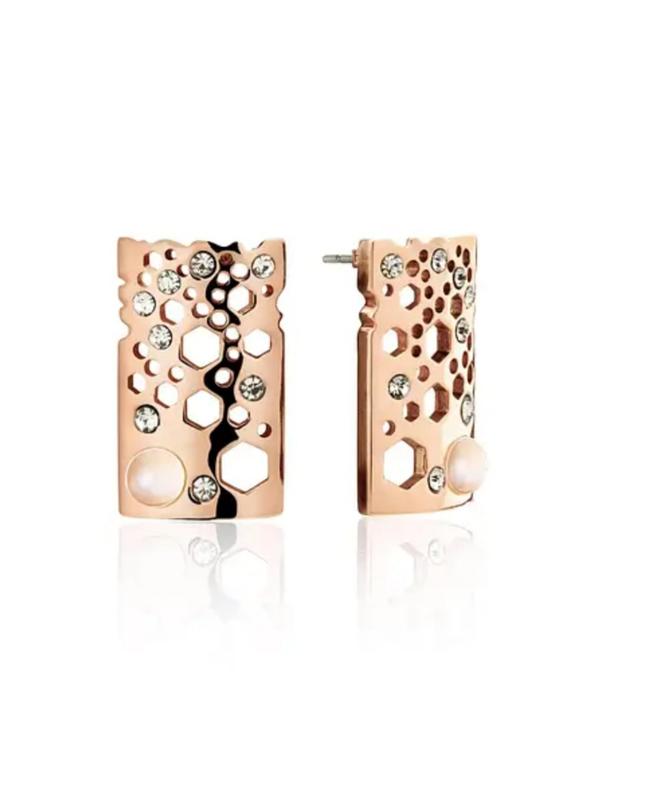 Місячний камінь - мінерал витончених осіб з безмежним творчим потеницалом і виразним внутрішнім світом. Оригінальні пластини з покриттям з рожевого золота немов зірки усипані кристалами, а в орнаментальних просвітах відіграють форми безмежного простору. Тонкий штрих - крапля місячного каменя, в якому прихована вся магія і чарівність космосу.