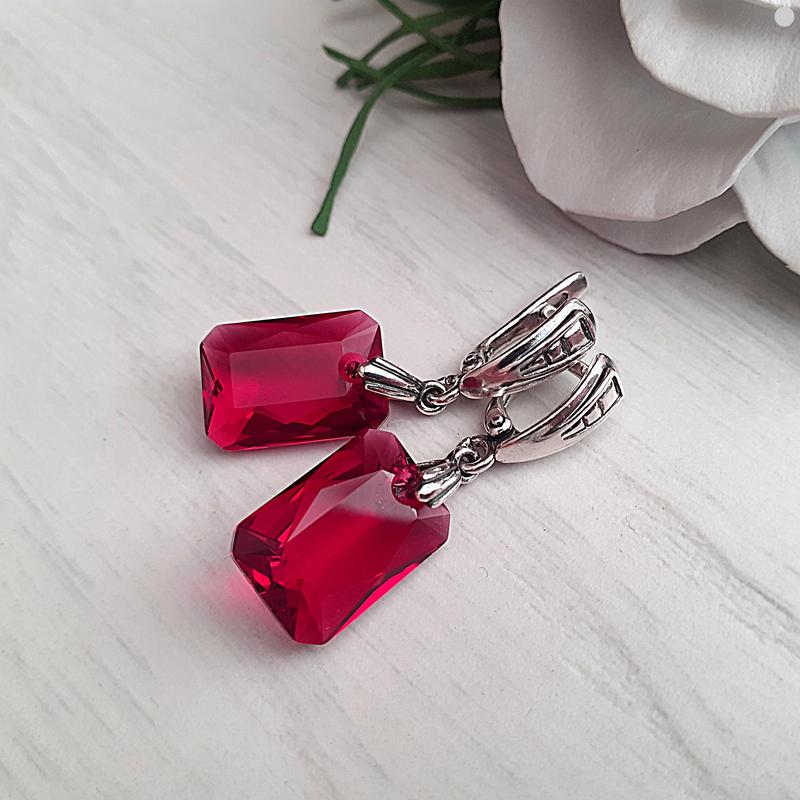 Эффектные серебряные серьги ручной работы с кристаллами Emerald Cut. Цвет – Scarlet – шикарный красный оттенок. Кристалл полностью прозрачный. Выглядит вживую прекрасно! Длина кристалла 16 мм. Длина серьги примерно 35 мм. Фурнитура производства Украины из черненого серебра 925 пробы. Замочки на серьгах – английский замок, очень комфортные и удобные. Великолепные серьги с великолепными кристаллами Сваровски, в которых Вы будете в центре внимания всегда!