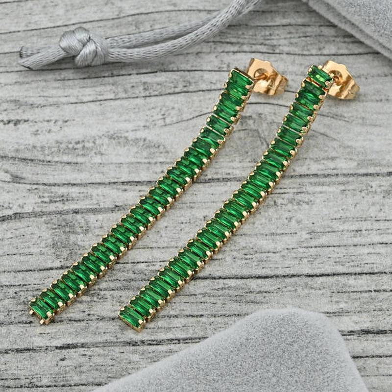 Серьги подвески размер 57х5 мм зеленые фианиты вес 3.8 г позолота 18К.