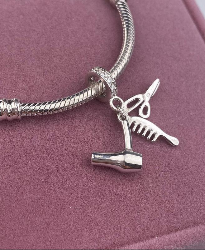 Шарм срібний набір перукаря - красиве та яскраве доповнення браслета типу "пандора". Також цей шарм можна носити на шиї як підвіс. Шарм зі срібла покритий родієм, що забезпечує йому надійний захист від пошкоджень і додає красивого яскравого блиску. Зверніть увагу, що браслет на фото не йде в комплекті і його слід купувати окремо від шарму. Довжина 25 мм Середня вага 2.11 гр Покриття: родій