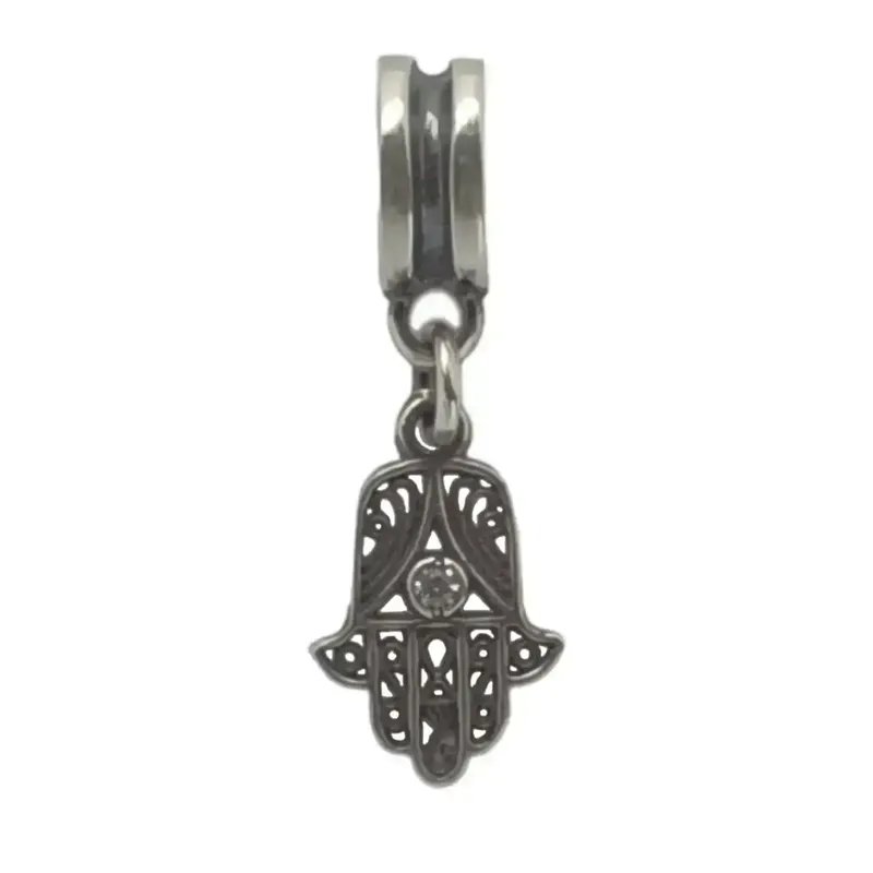 Шарм Рука Фатимы из серебра с фианитами 906-ч 💎 Диаметр отверстия: 5 мм 💎 Средний вес изделия: 0.90 грамм 💎 Вставка: кубический цирконий 💎 Средний вес вставки: 0.01 грамм 💎 Металл: серебро 925 пробы 💎 Покрытие: чернение