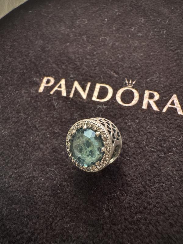 Оригінальний вінтажний шарм Pandora з великим огранованим каменем бірюзово-синього кольору. Камінь обрамлений дрібними блискучими вставками, що створюють ефект сяйва. Виготовлений зі срібла 925 проби, бічні сторони прикрашені ажурною сіткою. Шарм дуже яскравий, ідеально доповнить ваш браслет як центральний акцент. З особистої колекції, без упаковки. Стан добрий, потребує легкого чищення. Матеріал: срібло 925, фіаніт Колір каменю: бірюзово-синій Стан: вінтаж, без упаковки, потребує чищення Оригінал Pandora