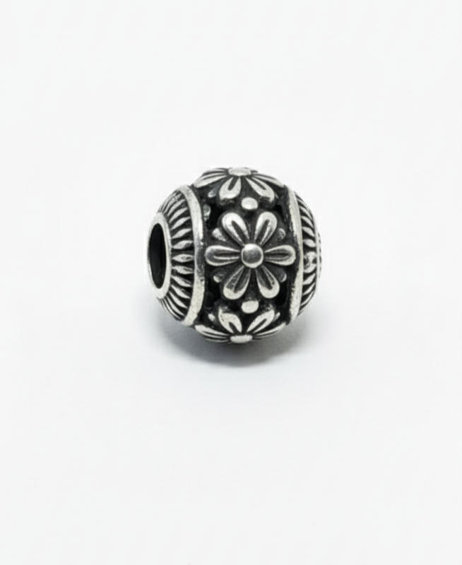 Квітковий візерунок Це справжня знахідка для поціновувачів витончених прикрас. Кожен шарм має унікальний дизайн, що поєднує в собі квіткові та геометричні візерунки. Завдяки чорнінню, що підкреслює рельєф, деталі виглядають особливо виразно. Виготовлені з високоякісного гіпоалергенного медичного сплаву, ці шарми є довговічними та безпечними для шкіри. Їхня структура дозволяє вільно переміщатися по браслету, надаючи йому динамічності. Ці універсальні намистини чудово поєднуються як між собою, так і з іншими шармами. Вони стануть чудовим доповненням до вашої колекції, додаючи їй весняного настрою та унікального шарму.