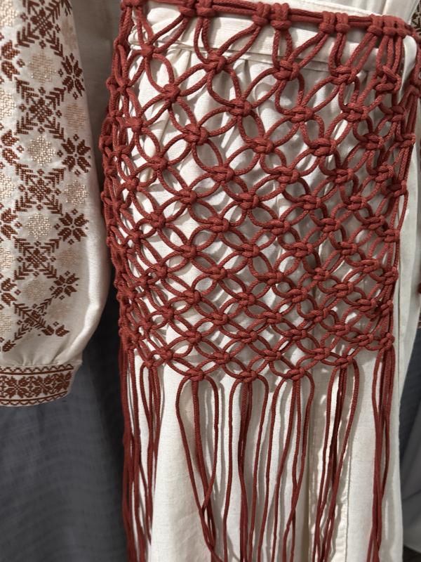 Пояс або накидка виконана технікою - макраме. Вона створює декоративний ефект і виглядає як обʼємний пояс чи фартух, спадаючи довгими нитками вниз. Такий елемент може мати як естетичну, так і символічну функцію в українському костюмі, а також буде чудовим доповненням до сучасних образів. Цей аксесуар ідеально доповнює етнічні образи, підкреслює талію та додає фактурності до лляних чи вишитих суконь. Водночас він легко поєднується з сучасним одягом, надаючи образу рустикального шарму та ручної автентики. Кожен вузлик — результат кропіткої ручної праці, у якій відчувається тепло рук майстрині й відлуння традицій.