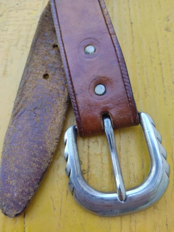 задовільний стан , довжина загальна 114 см до пошкодження 95 лента 110/90, ширина 3.8 см, товщина 4 мм ширина бляха 6см, довжина 5,5 см, сталь дірка по лента, 91-101
