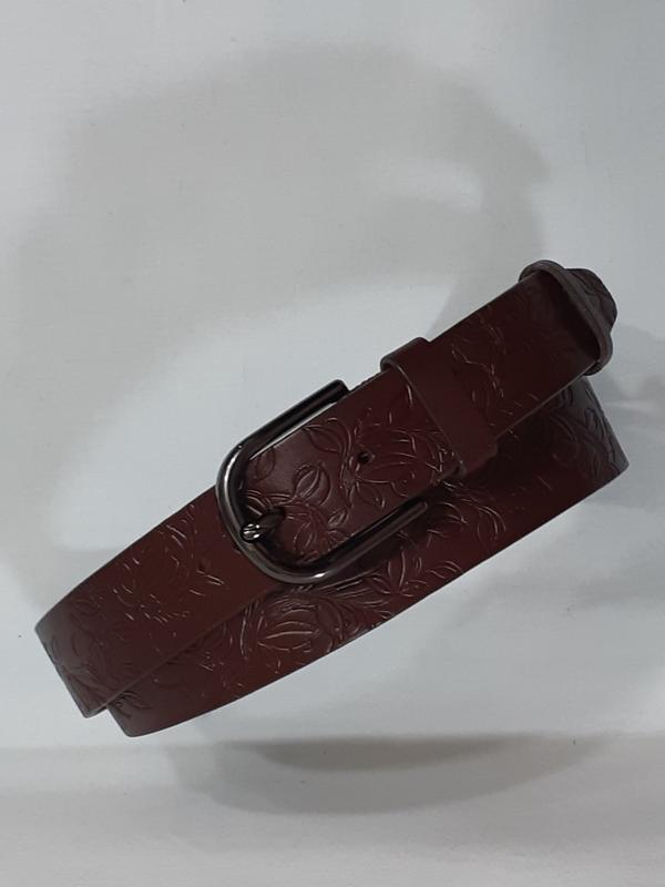 Красивый женский брючный ремень классического типа с великолепной кожей и красивой чёрной пряжкой. Вдоль кожаной полосы накатка с растительным узором. Кожаная полоса бордовая очень мягкая, гладкая с небольшим глянцем. Ширина кожи 33,8 мм (под пряжку 35 мм); толщина 3,3 мм. Длина ремня 122 см (на объём до 107 см), возможна обрезка кожи по длине. Пряжка серии 35.88 классического типа чёрная блестящая.