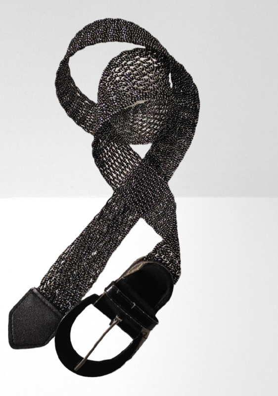 Стильный, плетеный ремень, пояс Размеры: Длина с учётом бляшки 111см Ширина 4см Длина бляшки 5,5см Материал - текстильная прочная веревочная нить с люрексом и лак экокожа Цвет-черный/серебристый