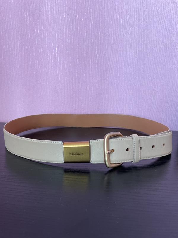 Кожаный ремень Max Mara Состояние: очень хорошее. Небольшие следы носки,есть потертость на пряжке(фото) Р-р:длина полотна 108см, до первого отверстия 89см до последнего 99см,ширина 4,7см