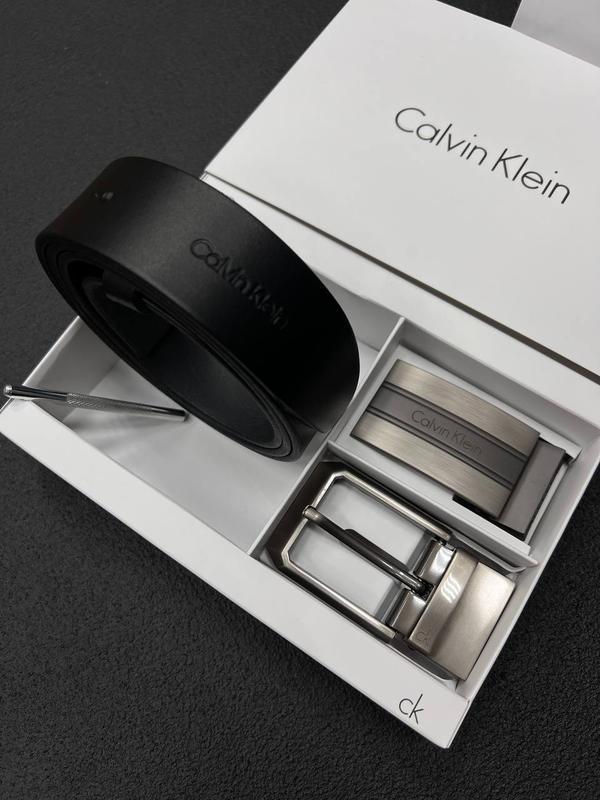 Мужской ремень calvin klein черный с 2 пряжками на подарок / подарочный набор