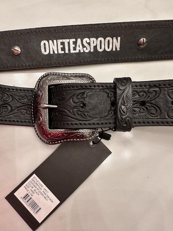Стильный ремень из натуральной кожи , тесненным узором и декоративными металическими заклепками. Цвет-черный