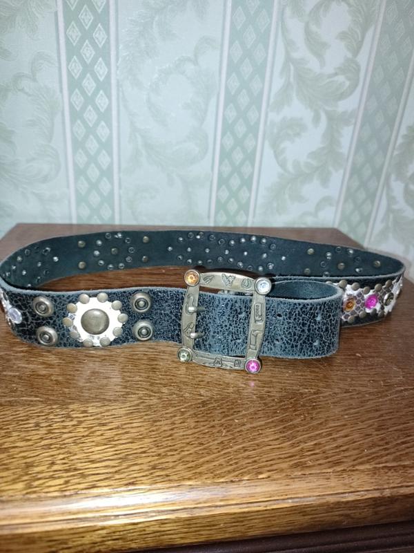 Пасок кожаный в этическом стиле с декором из страз, заклепок и фактурной кожи в виде пинтона. Длина 100см, ширина 4см, пряжка 5Х6см. Стильная и неординарная вещь