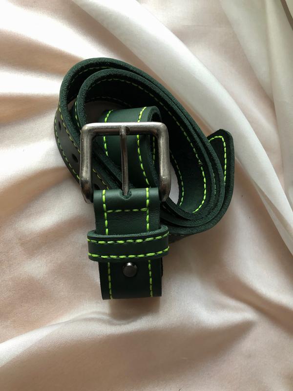 Темно-зелений ремінь ручної роботи з салатовою строчко