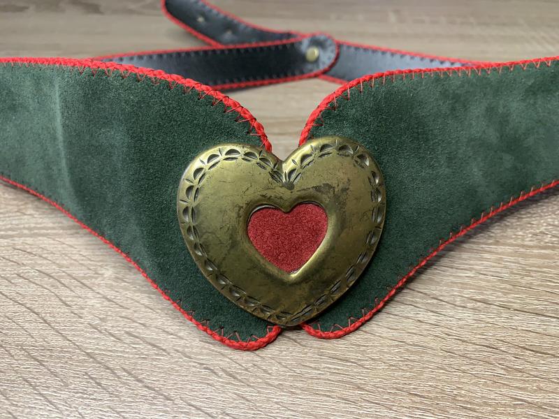 Особливий вінтажний смарагдовий шкіряний пасок на талію, дуже гарно підкреслює фігуру. Дуже гарна фурнітура і кольори. В дуже хорошому стані, невелика тріщинка на застібках.