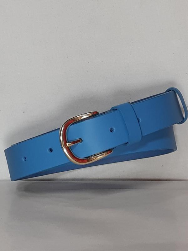 Ремень узкий голубого цвета кожаный. Кожа очень мягкая, плотная с небольшим глянцем, имеет гладкую текстуру. Ширина кожаной полосы 28.7 мм (под пряжку с прорезью 30 мм); толщина кожи 3,1мм. Длина ремня 103 см (на объем до 88 см). Пряжка классического типа, желтого (золотистого) цвета блестящего. Ремень можно использовать как для женщин, так и для девочек-подростков. Ремень можно укоротить