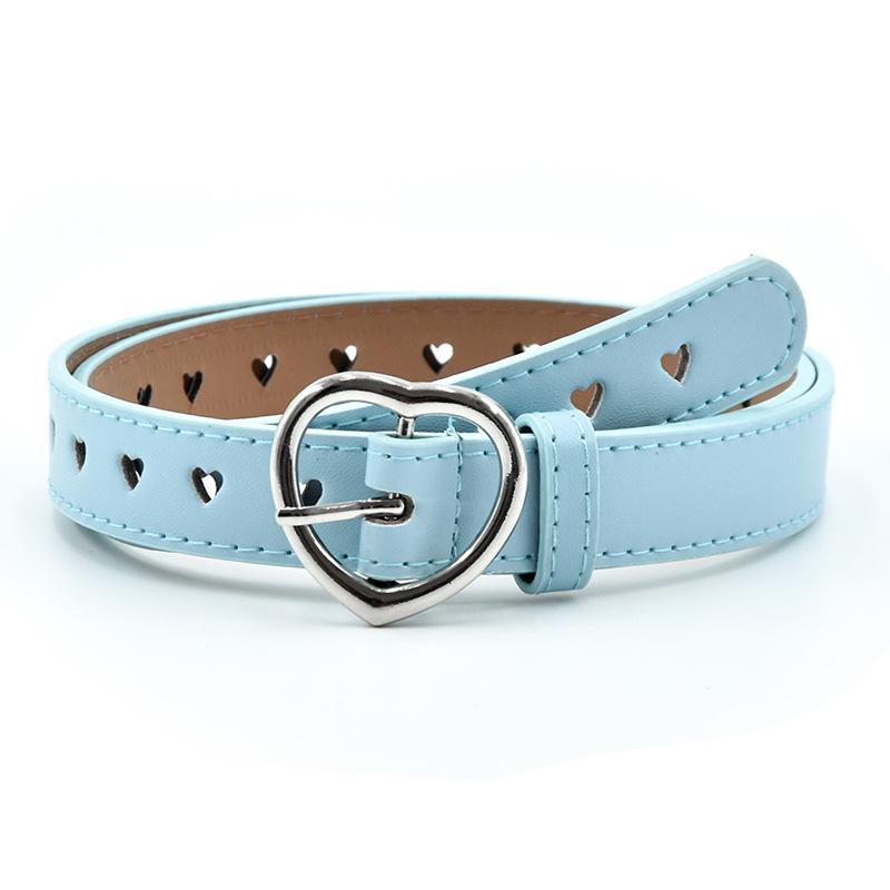 Детский ремень с пряжкой и отверстиями в форме сердечек. Материал – экокожа. Довжина 90 см, ширина 2,3 см. Классическая пряжка-гвозди из серебристого металла. Стильный аксессуар, который отлично дополнит образ девочки.