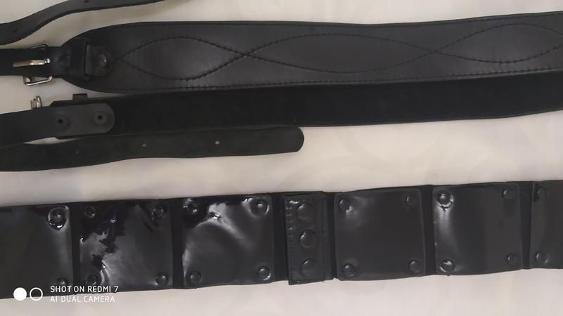Два ремня новые. 1 - кожаный черный длинной 98см и шириной 4см с фигурной прошивкой и заклёпками; 2 - лаковый на резинке с застёжкой на трёх кнопках. ширина 6 см , длина 90см. Цена за оба 260 грн