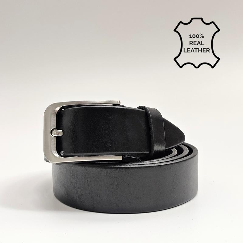 Черный брючный кожаный ремень 3,5 см с никелированной пряжкой