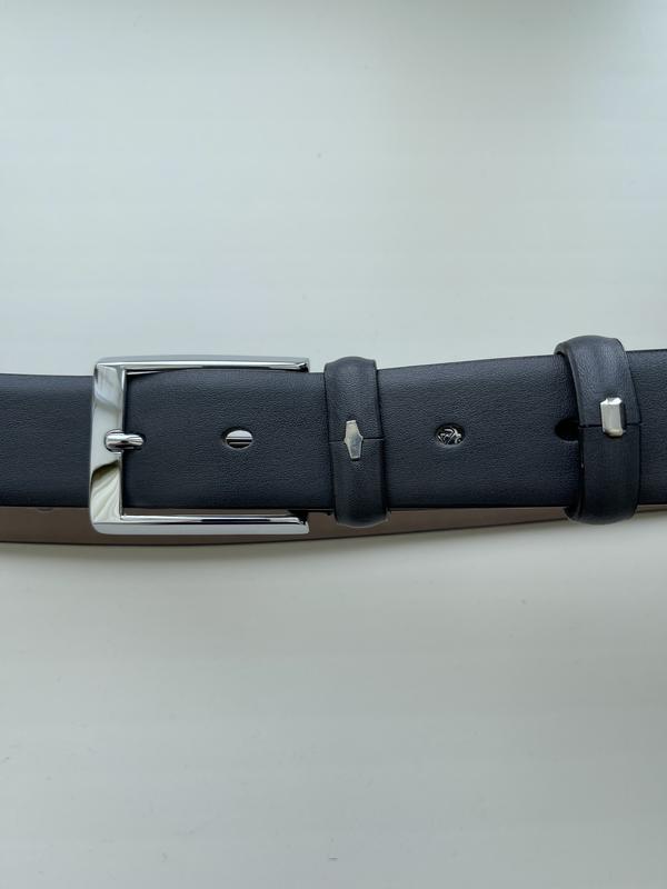 Новый кожаный ремень темно - серого цвета. Бренд ALON. Длина 102 см, до 2 отверстия 82 см, до последнего - 92 см. Ширина 3,4 см. Дефектов нет, кроме отмеченного ручкой крестика на внутренней поверхности.