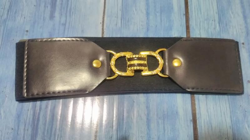 Пояс с плотной резинки, с элементами кожзам. Тёмно-синего цвета. Ширина 6см, длина в спокойном состоянии 71см.