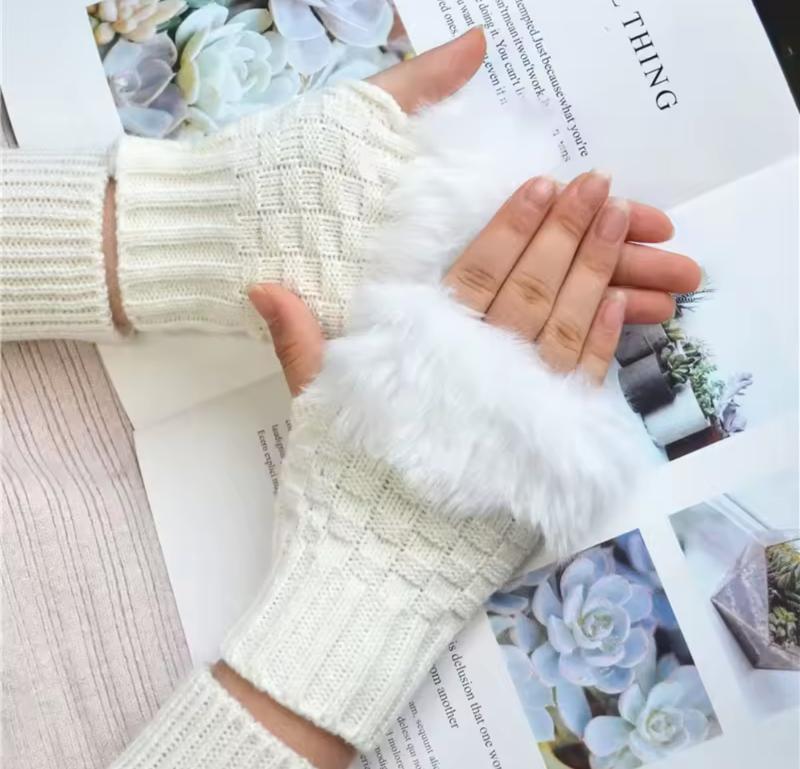 Перчатки белые варежки пушистые рукава вязанные митенки