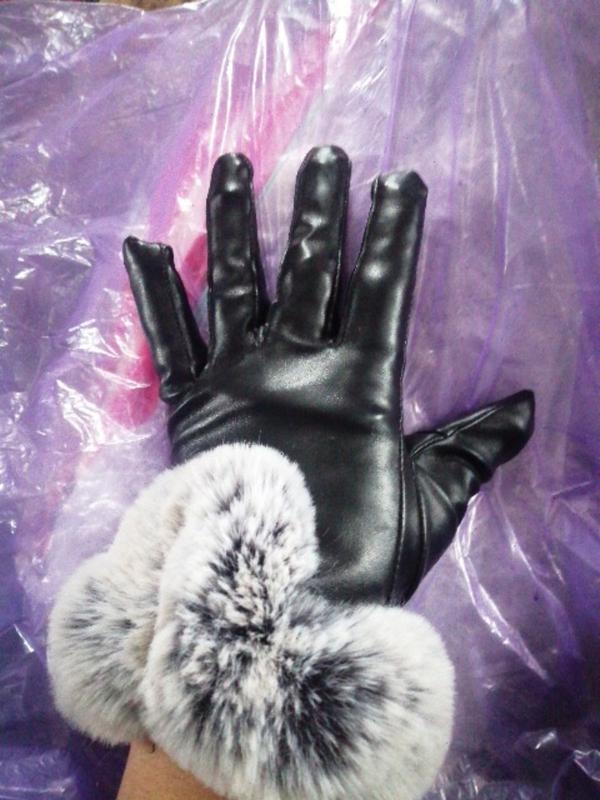 Чорные, похожие на кожу, но не кожаные. Ч легким утеплением, мех не натуральный. На тонкую руку. Новые, покупала себе, не влезла рука.