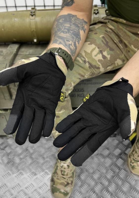 Рукавички M-past мультикам Размеры M, L, XL M-Pact обеспечивает максимальную защиту от кончиков пальцев до запястья. Анатомическая конструкция перчаток делает их очень комфортными и включает в себя: боковые панели из тянущегося материала для удобного обхвата пальцев и кисти, формованные манжеты для фиксации запястья, резиновые панели защищающие пальцы. - Дополнительные накладки на ладони из вспененного материала, для лучшей защиты. - Эластичная манжета закрывается на липучку застежкой из формованной резины.