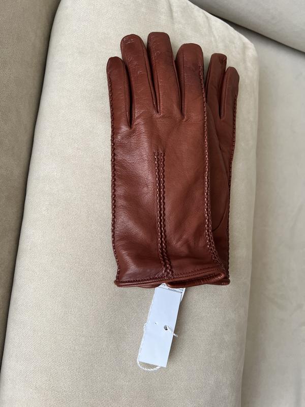 Шкіряні перчатки від MaxMara fashion group, придбані в офіційному аутлеті бренду. Всередині є штрих код оригінальності продукту. М’яка шкіра, вовна всередині. Колір бренді. Розмір м/л підійде на довгі пальці. Є нюанс: смужка від наклейки аутлету на середньому пальці внутрішня частина та трохи відрізняється колір (останні два фото). В носці не видно, знижка 25% вже від собівартості.