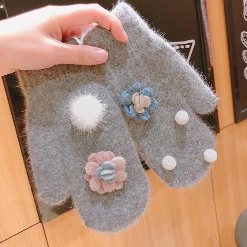 Шерстяные женские варежки с цветочком. тёмно-серые
