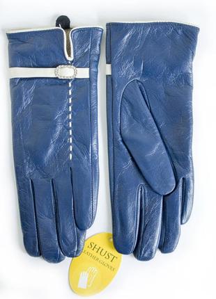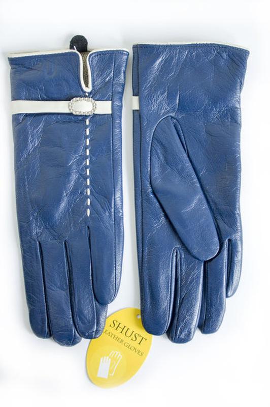 Модные женские кожаные перчатки в синем цвете. Трендовый цвет и элегантная отделка. Надежные в использовании и мягкие на ощупь.