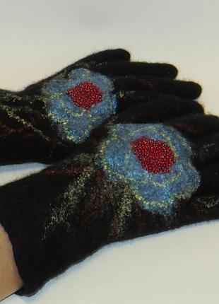 Перчатки ручной работы. Выполнены в технике мокрого валяния из нежнейшего мериноса 18 мкм и волокон вискозы,расшиты чешским бисером. Очень теплые, нежные, не колются. Длина большого пальца 6,5 см, длина среднего пальца 8 см, длина перчатки 27см , обхват ладони выше большого пальца-20см. Дополнительные характеристики: Пол: Женский Цвет : Черный Материал : Шерсть Сезон: Весна / осень Сезон: Зима