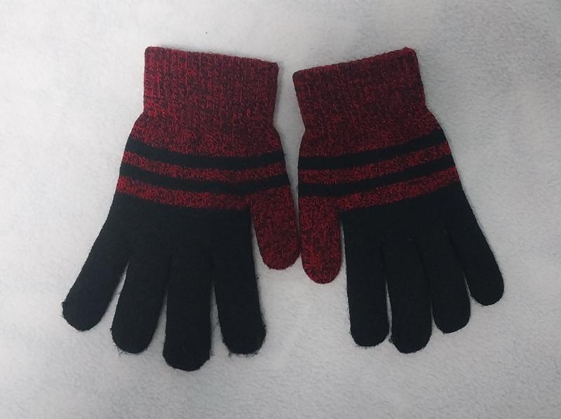Питательные, в хорошем состоянии, теплые, цвет: черный/бордовый. Размер: ширина де пальцы 7см, длина 17см, ширина резинки 3,5см.
