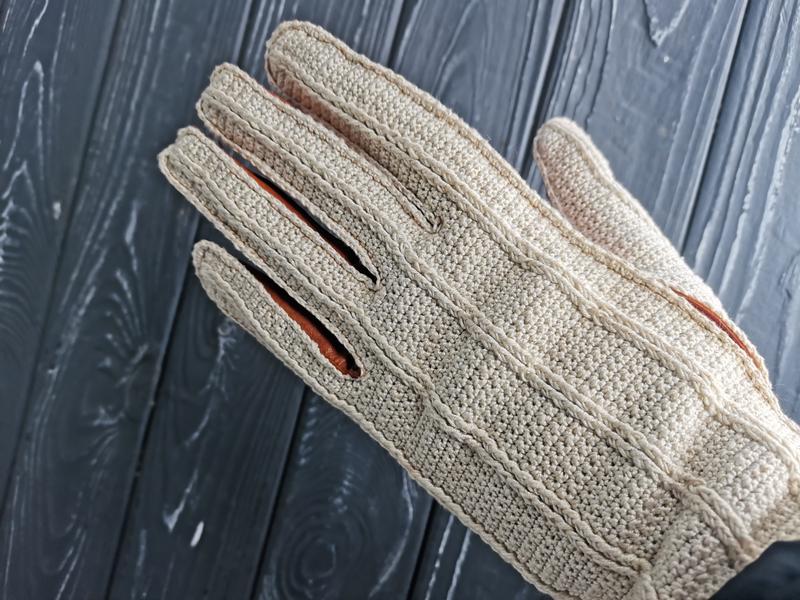 Перчатки из натуральной кожи - низ, верх-вязаный текстиль. Состояние отличное, нюанс-пятнышки на кончиках пальцев, на фото показано. На худую руку.