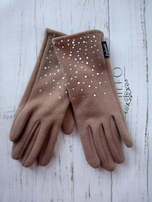 Теплі текстильні рукавички на флісі прикрашені стразами. Стан, як для вживаного, відмінний. Склад тканини: бавовна-30% поліестер -65%, еластан -5%. Розмір вказано 8,5. Вимірювання на фото. Колір – молочний шоколад.
