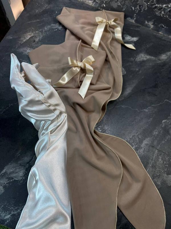 Эти изящные чулки ручной работы из эластичной сеточки напоминают о нежности и легкости прикосновения. Ткань мягко окутывает силуэт, подчеркивая грацию каждого движения. Особый акцент добавляют атласные банты, нежно завязанные, создавая игривый, и в то же время элегантный образ. Дополнением к этому ансамблю выступают высокие атласные перчатки с эффектными драпировками. Их блестящая текстура переливается, будто лунное сияние, добавляя нотку загадочности и утонченности. Чулки 1250 грн, перчатки 900 грн