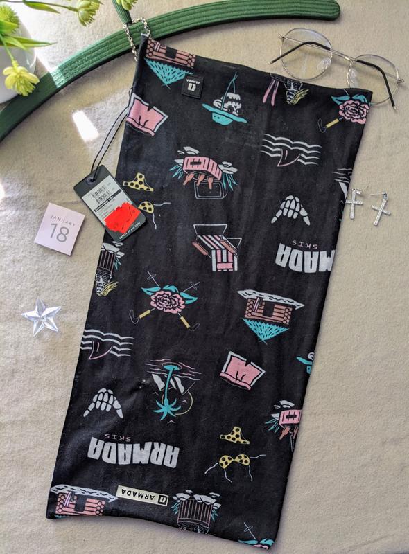 многофункциональный очень качественный бафф баф снуд По ширине могу потянуть 5 см новый с этикетку но имеет пару микронных зацепок, скорее всего, в магазине, абсолютно незаметны и ни на что не влияют это очень хорошая вещь которая реально выручает и голову согреет и шею, классная штука Очень рекомендую. всегда беру в себя такую в рюкзаке в холодное время года