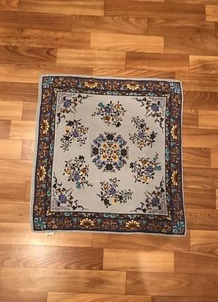 Очень интересный и стильный дизайн платки.Хорошо драпируется,бирка есть.Без дефектов, состояние идеальное, размер 52*55, шов роуль.