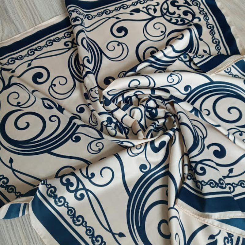 Красивый платок из искусственного шелка, атласа с узором. Ткань тонкая, легкая, очень приятная. Производство Турция. Состав - полиэстер. Размер 70*70 см. Можно носить на голову как платок и повязку, как косинку на шее, украсить волосы, сумку. Цвет – темно – синий + кремовый. Есть разные цвета. На странице большой выбор платков, палантинов, шарфиков, теплых платков-пледов, косинок на любой вкус Ссылаю укр-почтой, Meest и Новой почтой, оплата на карточку!