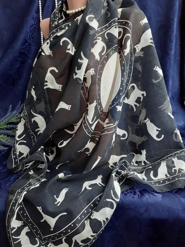 Завораживающий принт! ❄Белая кошка❄ — символ защиты! Животное не допускает негативную энергетику и прекрасно справляется с ролью защитника от любых невзгод, скандалов и зависти. А если таких котов много, и каждый из них ходит по кругу, мурча свою защитную мантру?! Такой платок станет не только надёжной защитой, но и поможет осуществить самое заветное желание! 🎄🐈 Изделие винтаж, ручная работа, Индия! Выполнен из 100% тончайшего натурального хлопка (батист)! Шов с загибом, обработан вручную. Достаточно большой, размер: 105 × 105 см. Его можно обернуть как платок на голову, завязать причудливым узлом как палантин, или обернуть вокруг шеи! Основной цвет - насыщенный черный, принт - белый. 🌲❄ Состояние отличное, без дыр, пятен и прочих дефектов.