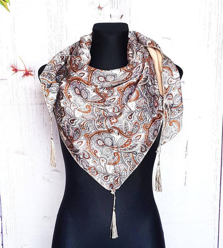 Платок косынка теплая на флисе на шею голову коричневые пейсли на бежевом