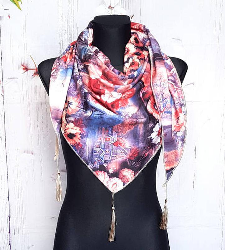 Платок косынка теплая на флисе на шею голову голубая пудровая цветы