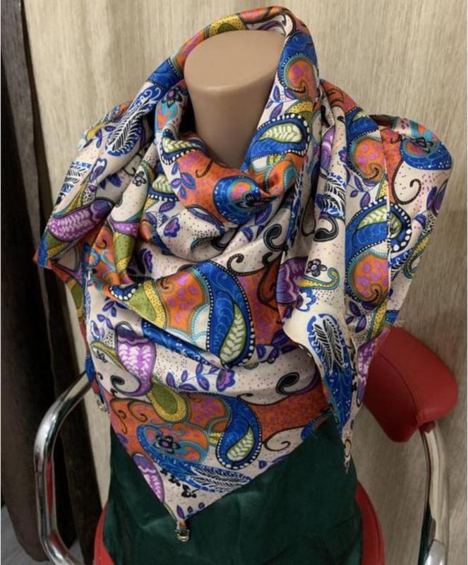 Платок шарф шелковый узоры треугольник Состав ткани шелк 20%, полиестер 80% Форма треугольника двойной пошитый платок Цвет разноцветный Шикарно дорого смотриться ткань