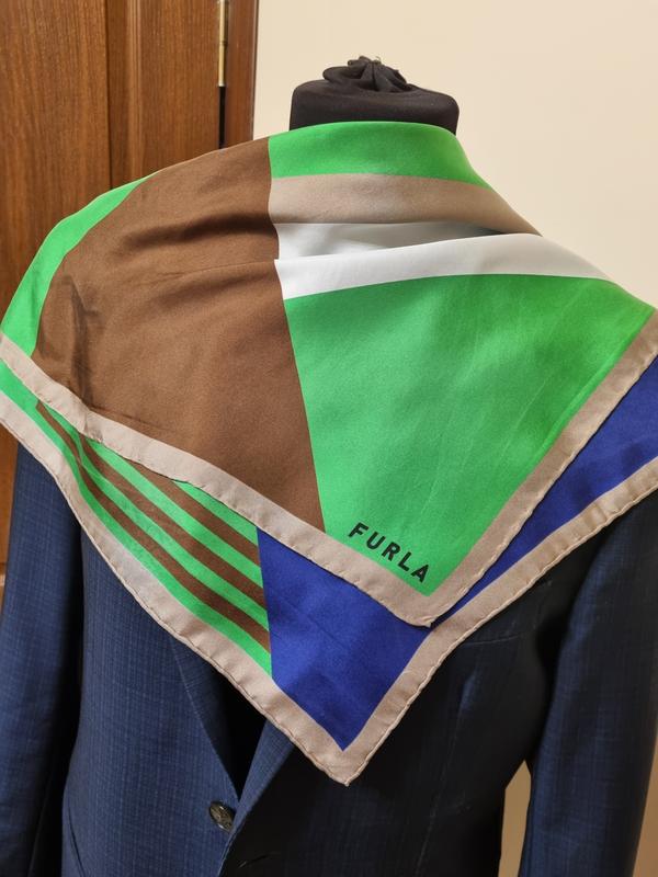 шелковый платок, не большой.на шею, а потому что на сумку.есть не большие следы от ношения (колышко ила).