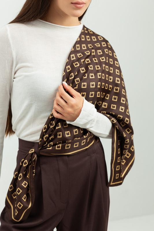 Тренд сезона 😍 Шикарный большой шелковый платок станет идеальным дополнением к Вашему образу👌 Такую платку можно носить повязав на шее, а также просто накинуть на плечи. Еще одним вариантом стилизации такого аксессуара является завязывание на голове различными способами. Помните и о том, что такой платок можно связать на сумку 👜 Ткань мягкая и приятная к телу, высокое качество! ✅️За счет модного дизайна и стильного сочетания цветов легко впишется в Ваш гардебор! ✅️ Материал: шелк армани (сатиновый шелк) ✅️ Очень нежный и приятный на ощупь материал ✅️ Размер: 90*90 см ✅️ Цвет: коричневый, бежевый