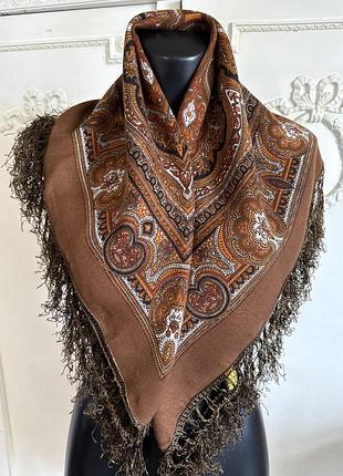 Чудова вінтажна хустка в коричневих тонах. Склад:поліакріл, оздоблення-ві коза. Розмір :76х76 см(без китиць). Стан ідеальний.