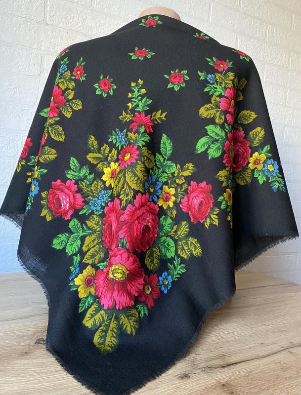 Тернова набивна вовняна хустка 98×98 см з квітковим орнаментом Вінтажна тернова набивна хустка з натуральної вовни, виконана у традиційному українському стилі. Насичений чорний фон підкреслює яскравий малюнок із червоних, рожевих, жовтих та синіх квітів, що символізують красу, життєву силу та тепло. Матеріал м’який, приємний до тіла, добре зберігає тепло. 📏 Розмір: 98×98 см 🧶 Матеріал: 100% вовна, набивка 🎨 Колір: чорний фон, яскравий квітковий візерунок 📍 Стан: чудовий, без плям і пошкоджень Ця хустка — справжня класика української моди, що пасує як до святкового, так і до повсякденного образу. Підійде для колекціонерів або шанувальників народного стилю.