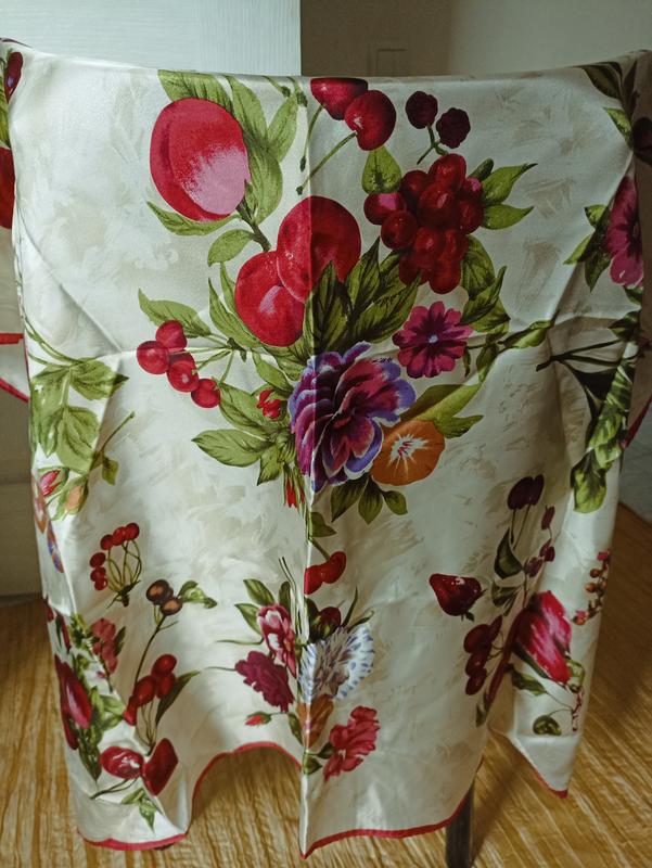 90 на 89см новое состояние край шов роуль бирки шелк и подпись американский бренд жаккардовый шелк, кроме фруктов и цветов есть еще фоновый рисунок абсолютно новое состояние можно на подарок является подарочная упаковка уп и нп отправляю из Днепра